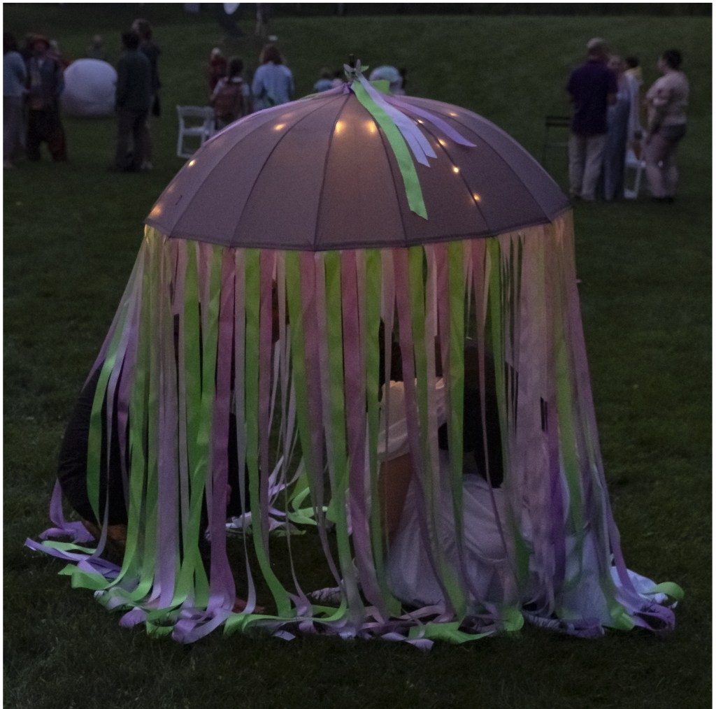 An immersive storytelling experience about Finding your Peace, Letting Go, Freedom and Openness to change, and Being Truly Alive. This is a 5 minute experience for a very small audience – one-on-one or group of two or three people. The audience joins the actor under a big ribbon umbrella, where they are gently invited into a story of a wise old master and a traveler who seeks the wisdom.